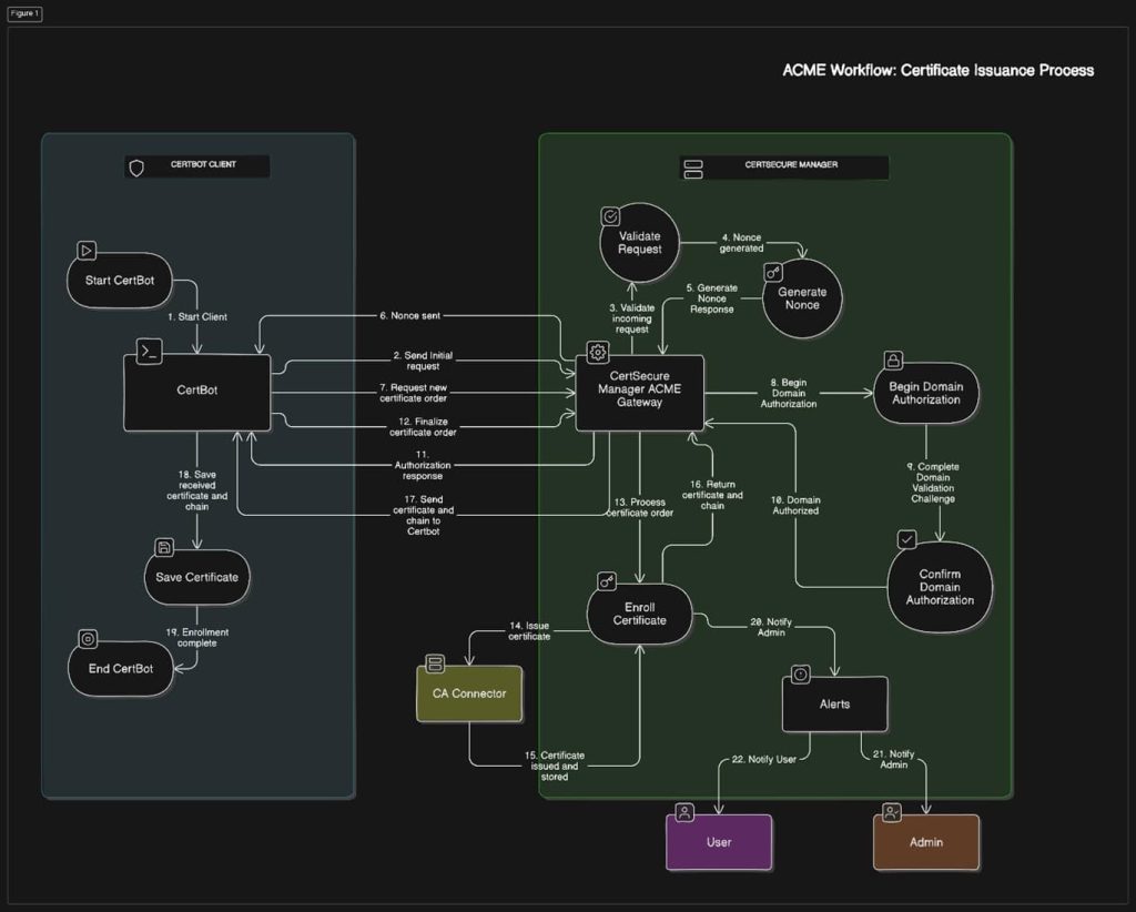 - Certificate Request: An ACME client, such as Certbot, initiates a request. CertSecure Manager acts as the ACME Gateway, validating the request and generating a nonce (unique token) to secure the session.