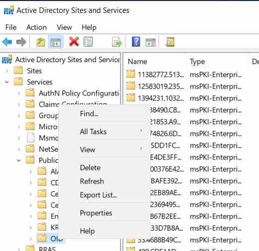 Expand Services. Right-click on the OID container located under “Public Key Services” within AD Sites and Services.