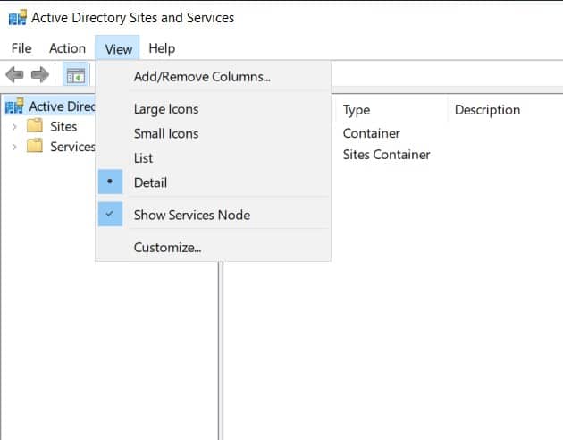 Open AD Sites and Services, ensuring that “Show Service Node” is enabled under the “View” menu.