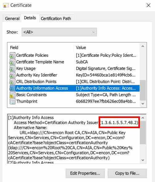 Examine the value assigned to the “msPKI-Cert-Template-OID” attribute to access the unique OID associated with the PKI instance.