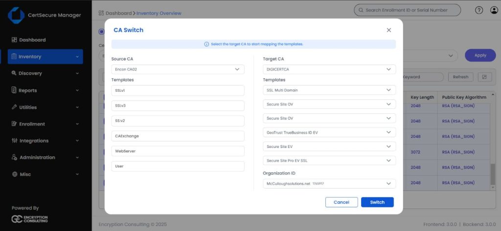 Manual certificate renewals and migrations are error-prone and time-consuming, especially at scale. CertSecure Manager’s bulk CA switching and renewal capabilities streamline these processes, reducing manual effort and minimizing downtime. Whether you’re migrating to a new CA or transitioning to stronger cryptographic algorithms, these features ensure precision and efficiency, even across thousands of certificates.