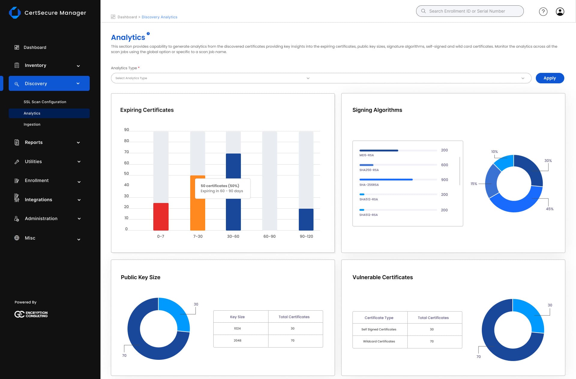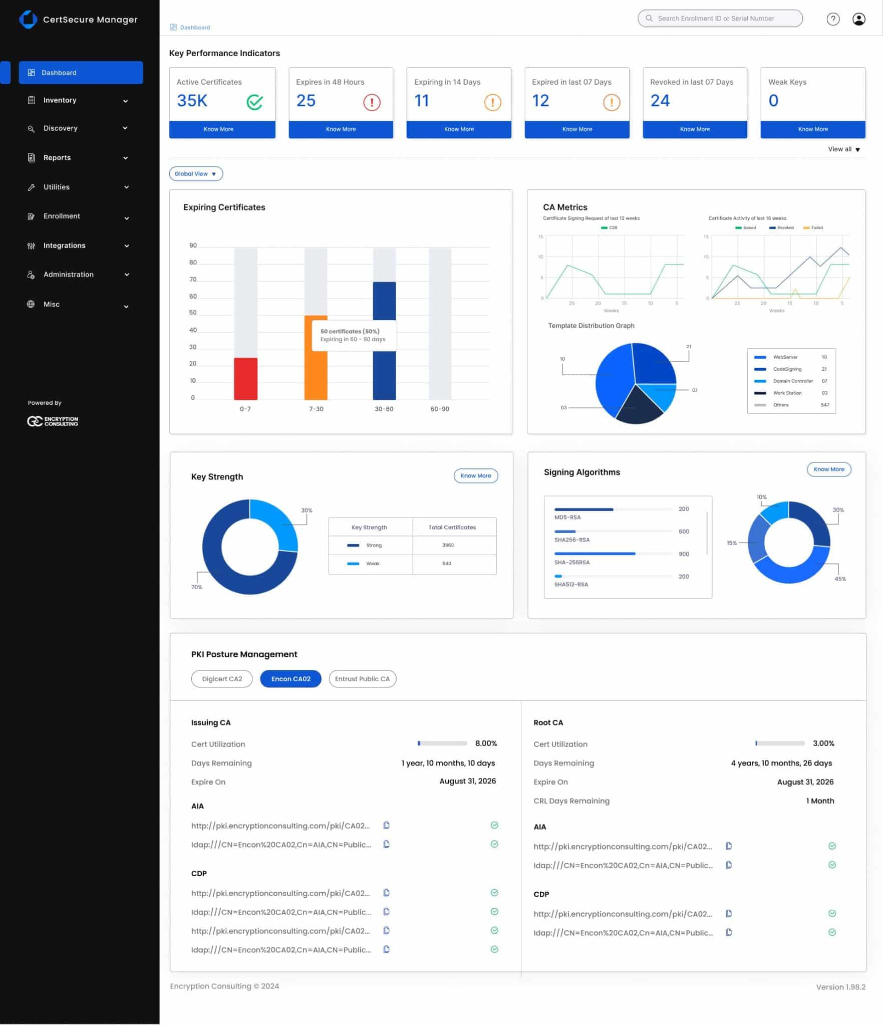 Navigating PKI data shouldn’t feel like deciphering a maze. CertSecure Manager’s updated dashboard consolidates critical metrics such as CA performance, cryptographic key strength matrices, and certificate expiration trends into a single, intuitive interface. This unified view helps you assess PKI health, identify bottlenecks, and plan strategic upgrades with confidence.