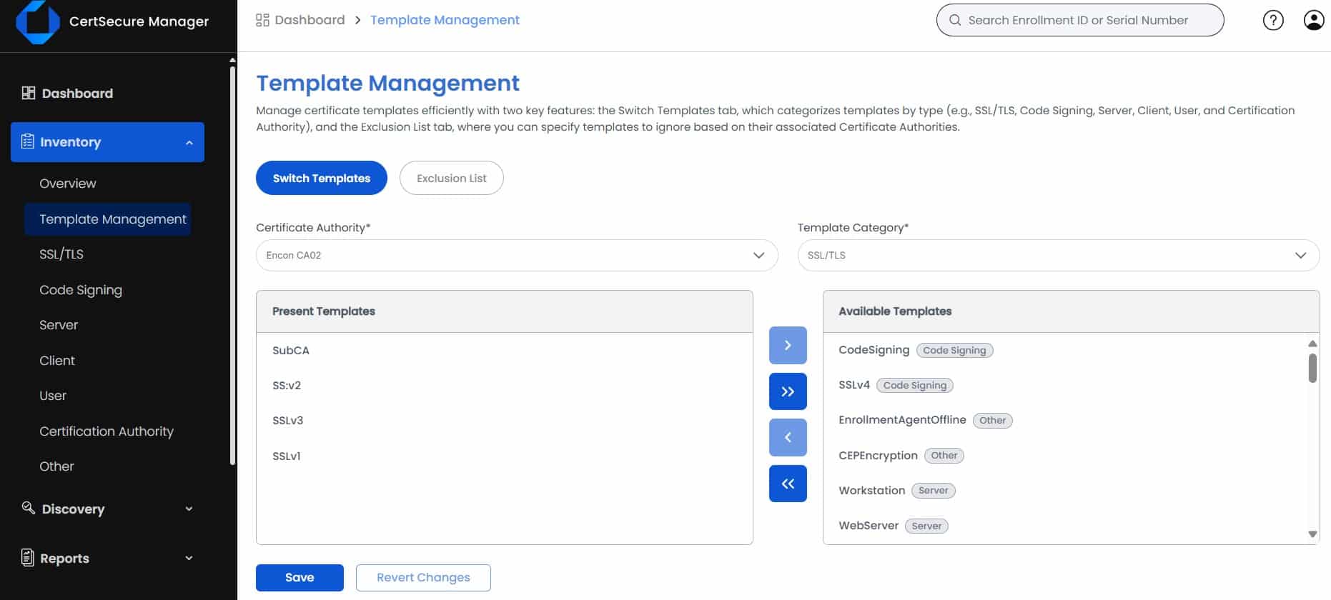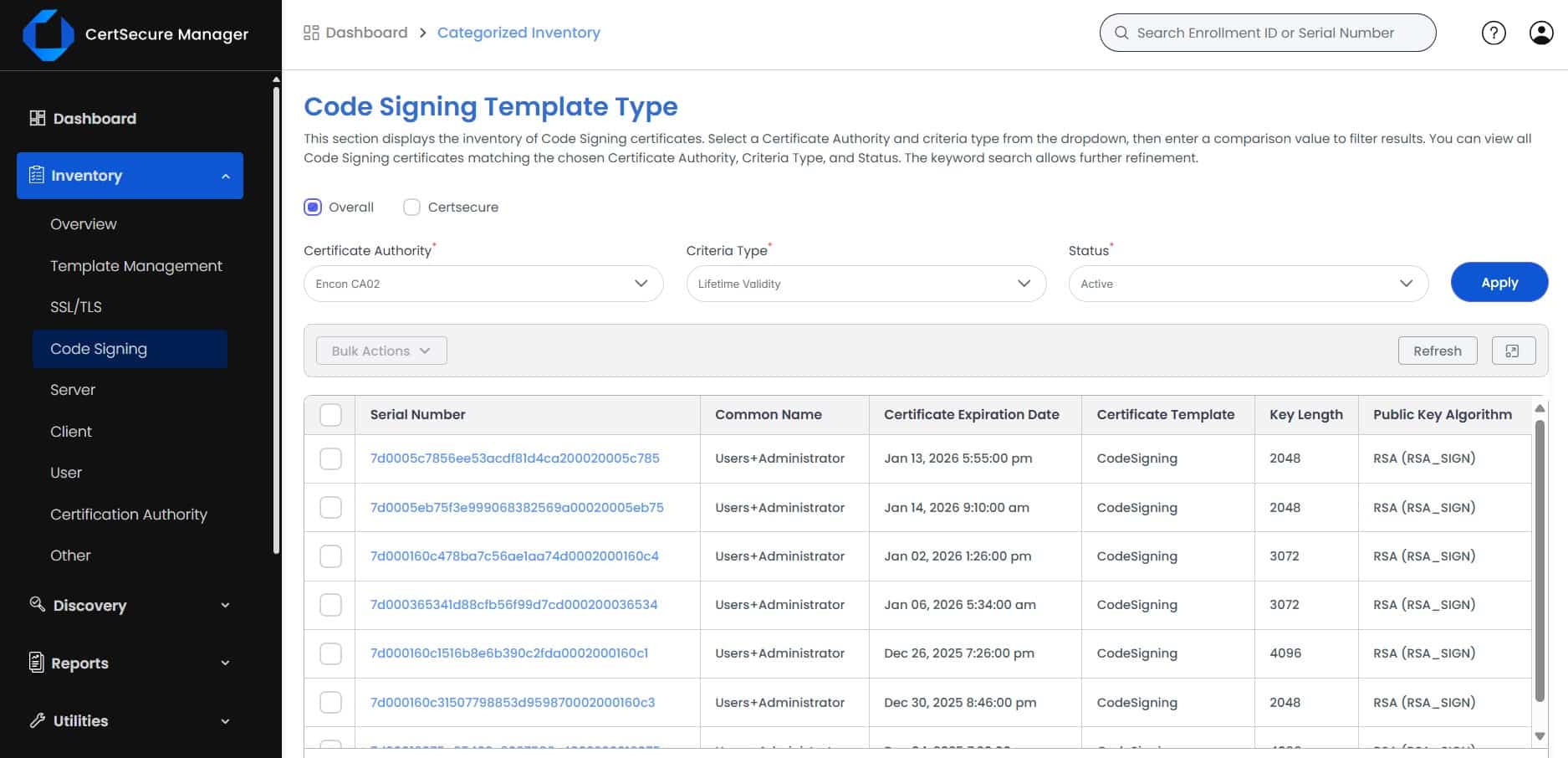 Certificate sprawl is a common challenge in large-scale PKI deployments. CertSecure Manager introduces template categorization, enabling you to organize certificates by type, such as SSL/TLS, User, Certification Authority, Code Signing, and others. Additionally, the platform gives you enhanced visibility of PKI posture for your individual Certification Authorities, as well as a unified global view. This structured approach simplifies inventory management, enhances searchability, and supports role-based access control (RBAC). It’s like having a finely tuned filing system for your certificates, ensuring every asset is accounted for and easily accessible.