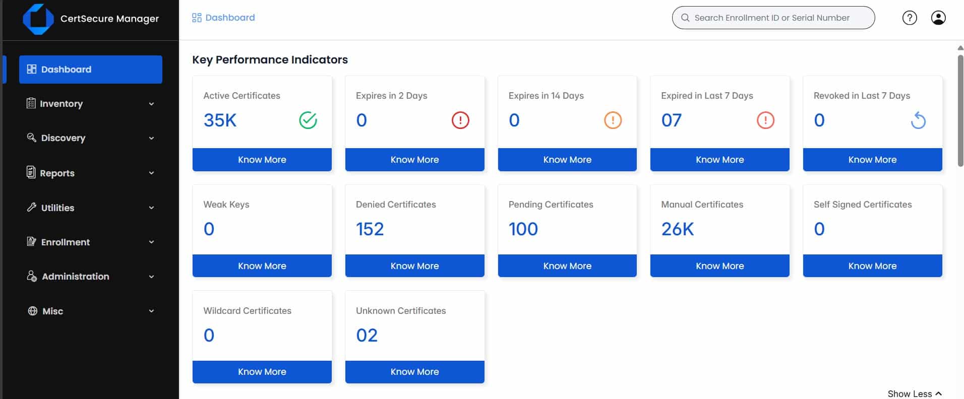 - Highlighting Key Performance Indicators (KPIs) on the CertSecure Manager Dashboard