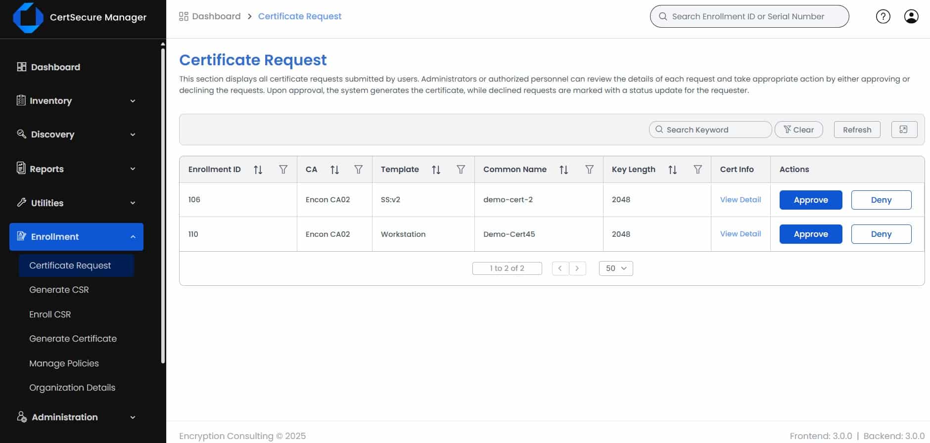 Not all PKI environments are created equal. CertSecure Manager’s new EJBCA integration ensures seamless certificate issuance, renewal, and revocation workflows, whether you’re working with legacy systems or modern, cloud-based PKI setups. This flexibility allows you to adapt to diverse environments without compromising on efficiency or security.